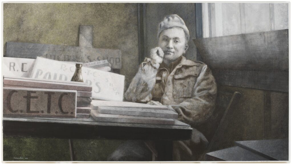 Jack worked long past the age of 65 at Transport Canada. His interests in retirement included cartooning and senryu, Japanese poetry based on 17 syllables. He published two books, the Senryu Cartoon book (1992) and Jack’s Japonica (2011). He was involved in Legion activities. He was also a volunteer at the Canadian War Museum for many years. The Canadian War Museum is honoring Jack with two portraits by artist Elaine Goble.