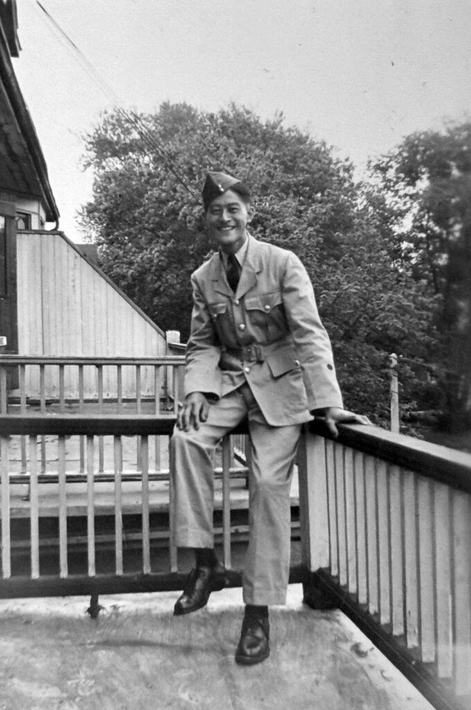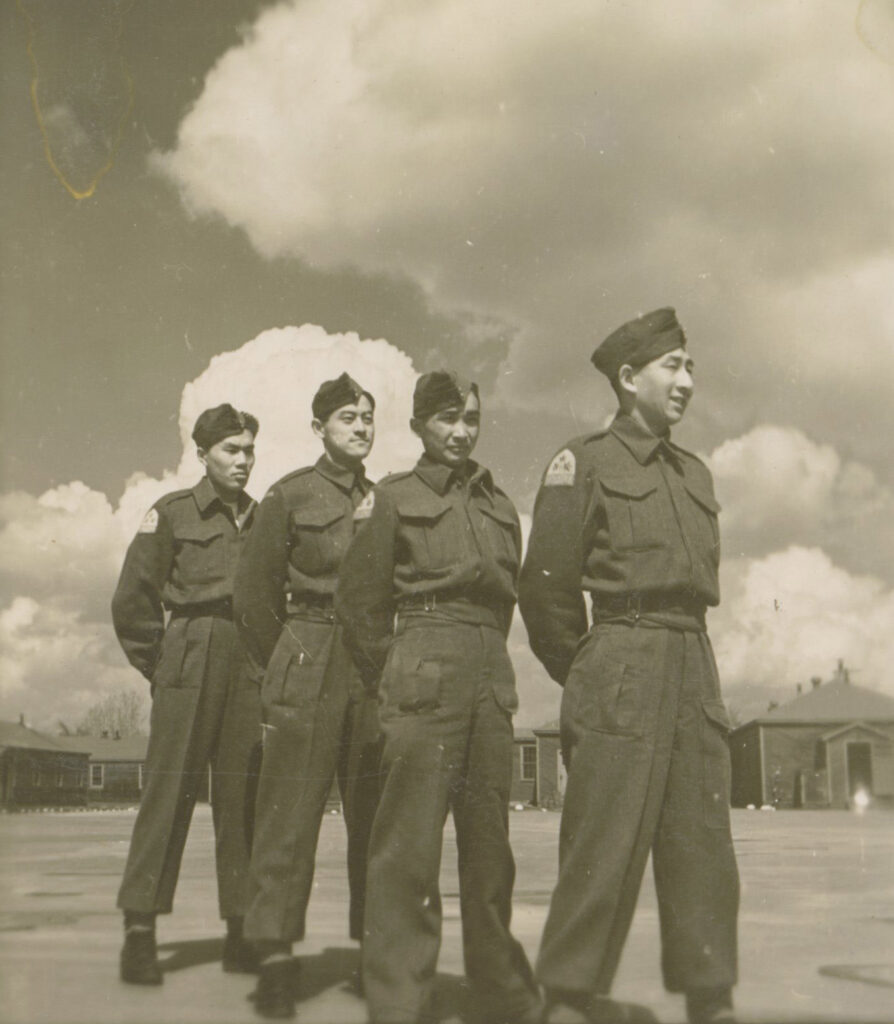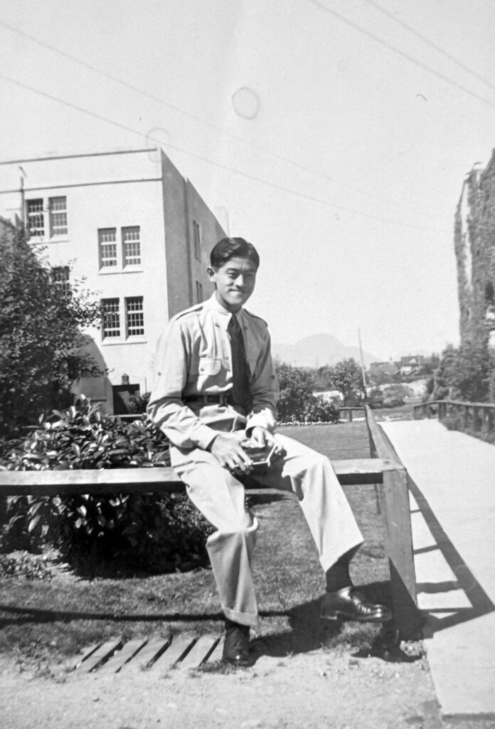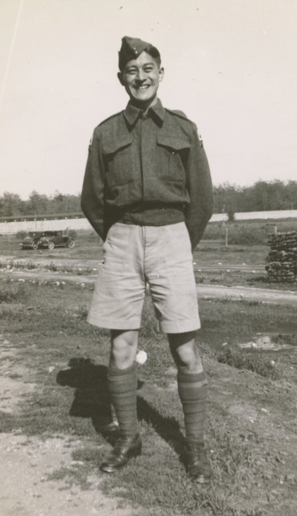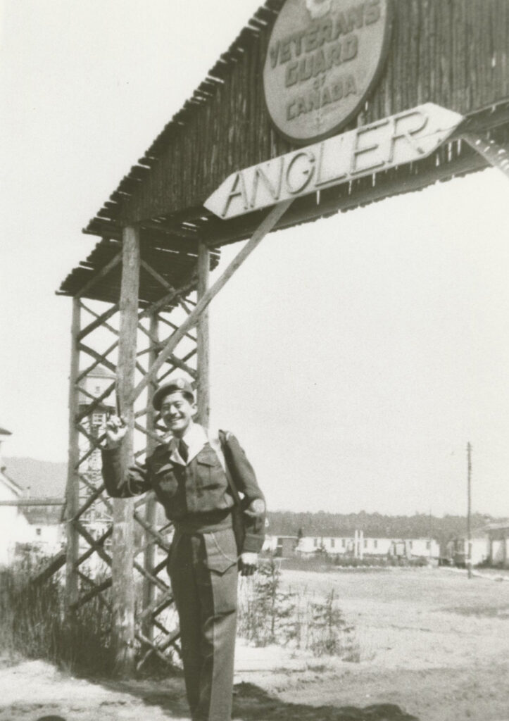 Roy Matsui in Front of Veterans Guard of Canada – Angler Entranceway; Ontario, circa 1945. Original source: Roy Matsui. Roy Ito Collection. NNMCC 2001.4.4.5.13.