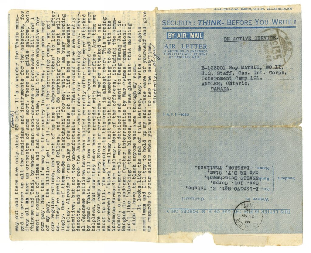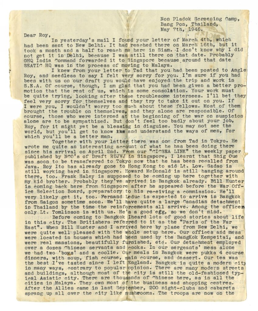 Letter written to Roy Matsui (Angler, Ontario) from Eiji Yatabe (Bang Pon, Thailand); 7 May 1946. Mary and Roy Matsui Collection. NNMCC TD 1471.