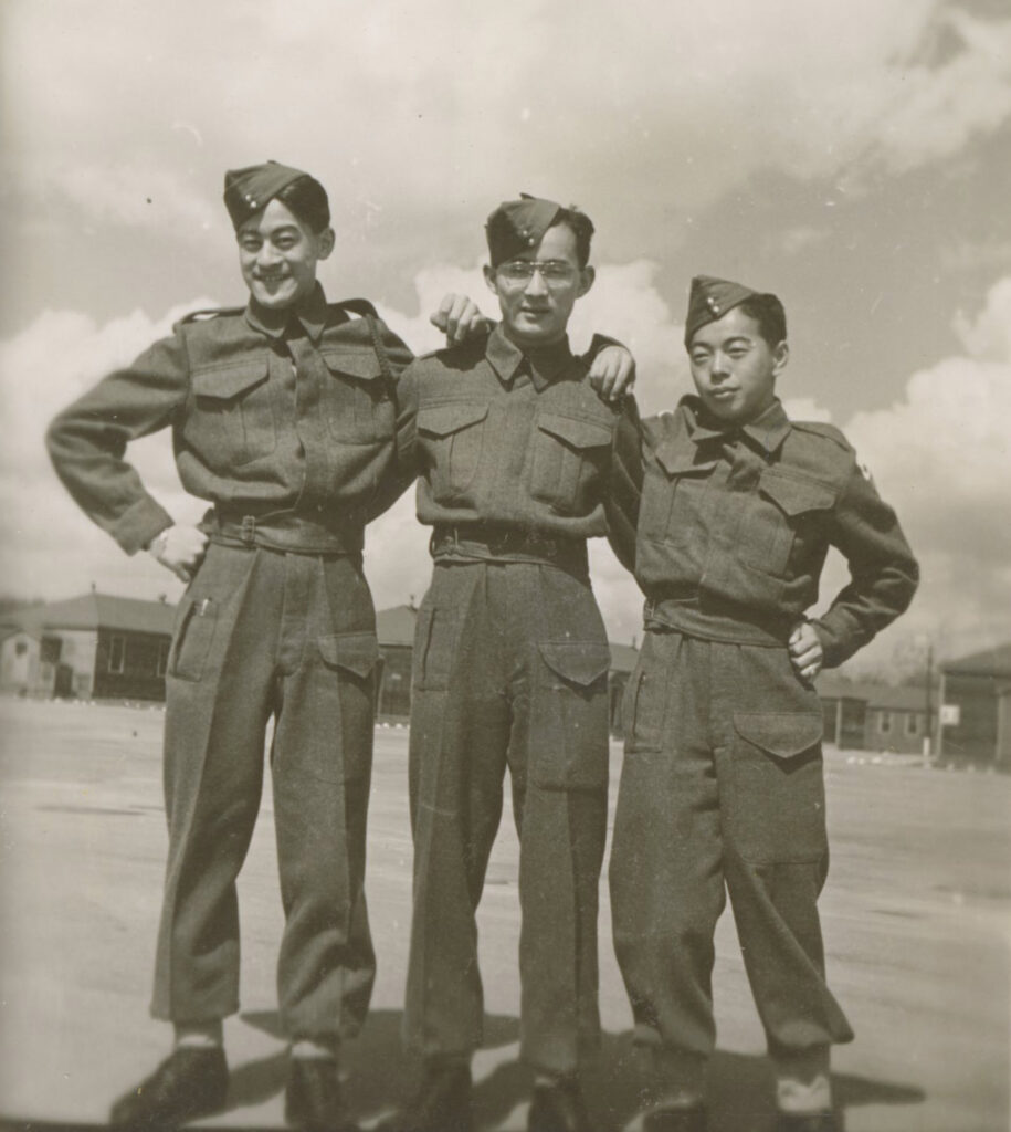 Roy Matsui with fellow S-20 soldiers, circa 1945. Roy Matsui on far left. Mary and Roy Matsui Collection. NNMCC TD 1471. Left to right: Roy Matsui, Dick Adachi, Kit Kitagawa.
