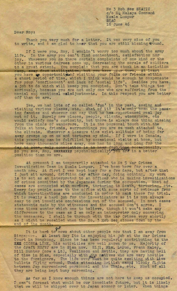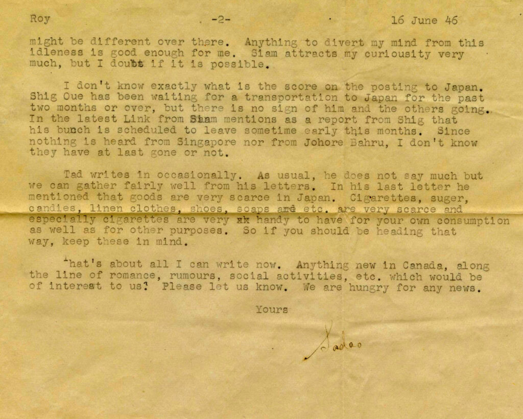 Letter written to Roy Matsui (Angler, Ontario) from Sadao Nikaido (Kuala Lumpur, Malaya); 16 June 1946. Mary and Roy Matsui Collection. NNMCC TD 1471.
