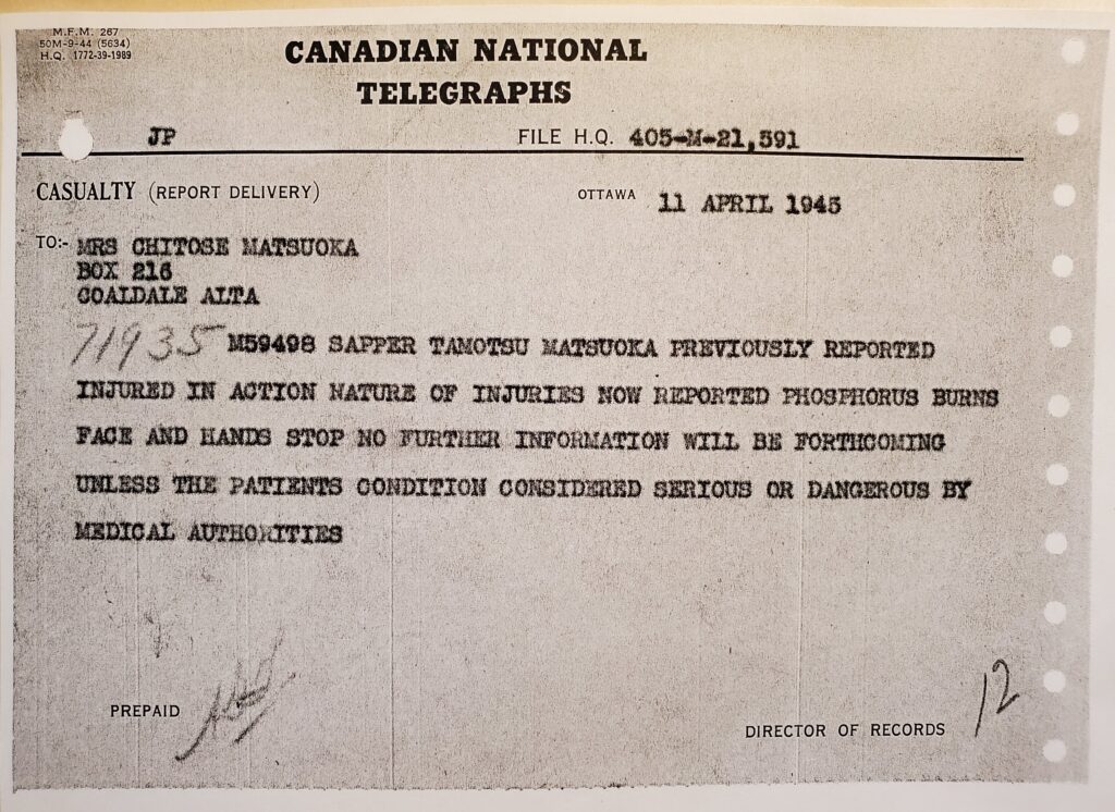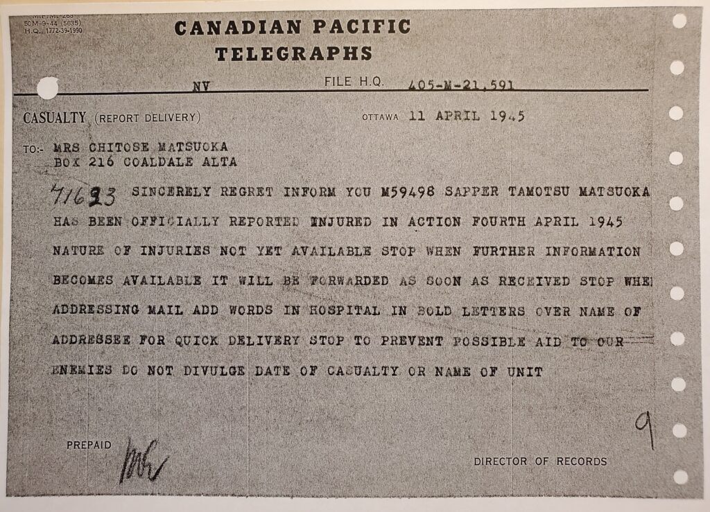 Telegrams sent to Tom Matsuoka’s mother reporting and describing his injuries; 11 April 1945. Courtesy of Max Matsuoka. Source: Veterans Affairs Canada, Library and Archives Canada.