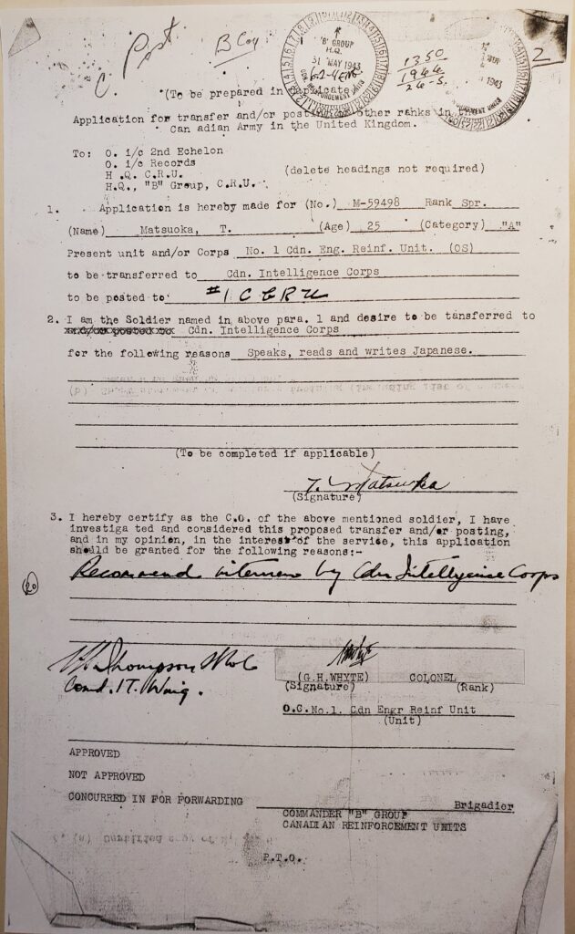 Tom Matsuoka’s request to transfer to the Canadian Intelligence Corps, submitted, but never approved; 31 May 1943. Courtesy of Max Matsuoka. Source: Veterans Affairs Canada, Library and Archives Canada.