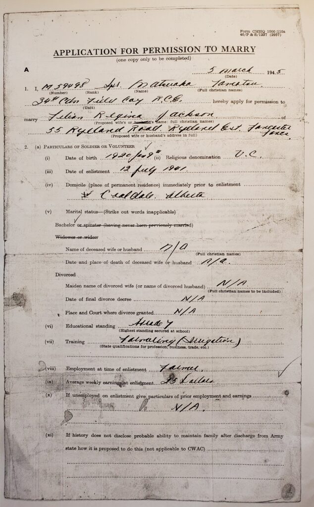 He completed a “Permission to Marry” form on March 5, 1945 and indicated that his bride-to-be was Lilian Regina Jackson of Lancaster, UK. Her father approved the marriage on April 30, 1945 and Tom’s commanding officer signed his approval on May 14, 1945. However, after the section for a ‘Decision of Higher Authority’ was submitted and approved on May 24,1945, it was later crossed out. No reason was given for this decision.