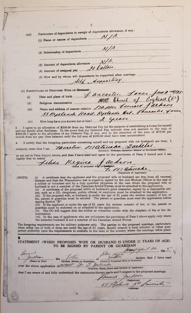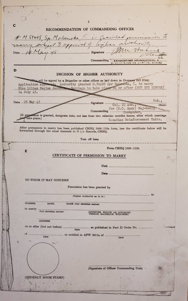 Tom Matsuoka’s three-page application to marry Lilian Regina Jackson. The request was submitted by Tom (March 5, 1945), signed by Regina’s father (April 30, 1945), recommended by commanding officer (May 14, 1945) and approved by a “higher authority” (May 25, 1945), however, the approval was later crossed out. No reason was issued. Courtesy of Max Matsuoka. Source: Veterans Affairs Canada, Library and Archives Canada.