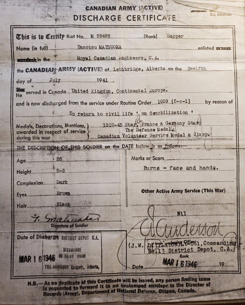 Tom Matsuoka’s Discharge certificate which includes a description of his injuries; Calgary, AB; 16 March 1946. Courtesy of Max Matsuoka.