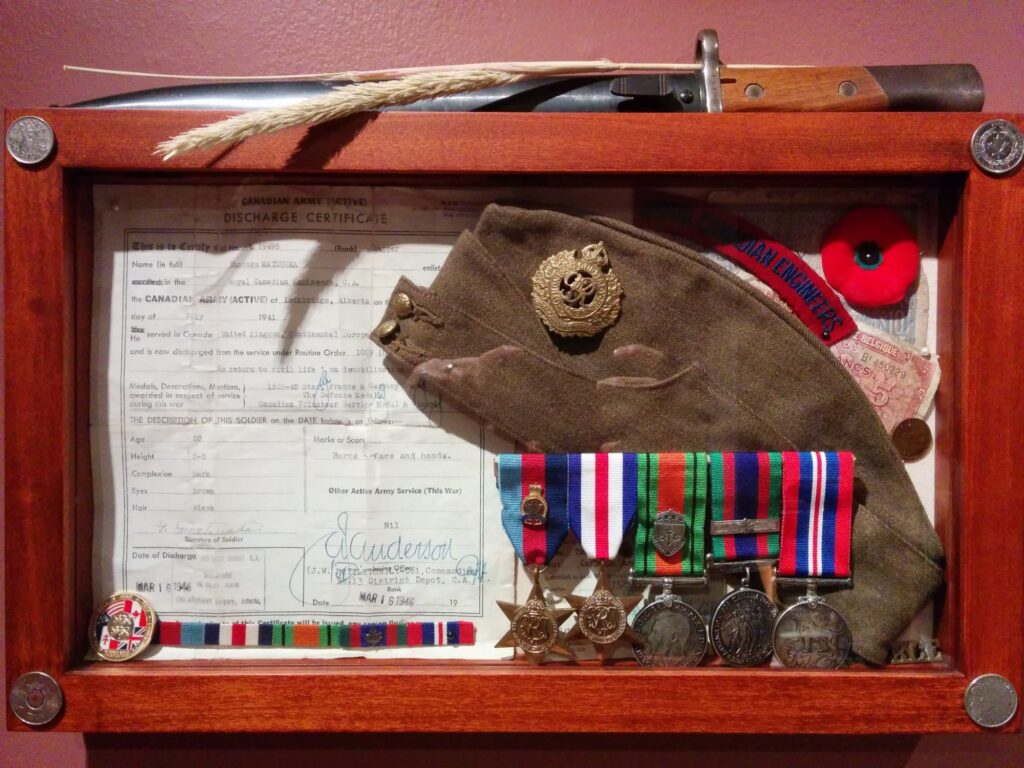 He was later assigned to the 34th Field Company. Tom Matsuoka was a Sapper (Combat Engineer) – Regimental No. M 59498. He was deployed to the U.K. to complete his training and landed on Juno Beach, Normandy two weeks after D-Day (June 6, 1944), where his Unit encountered heavy fighting around Caen. The Company built roads near Fontaine-Henry, north of Caen. During the crossing of the Seine, they ferried the Regina Rifles and the Canadian Scottish Regiment in storm boats over the river. When the Battle of the Scheldt launched on October 2, 1944, they cleared mines. Based from a chateau near Antwerp, they operated and maintained floating bridges in the area. The Unit trained other Companies in mine clearance and supported the 2nd Army Corps in a wide range of bridging and mobility tasks. Tom was with the 34th Field Company when he was injured by a phosphorus mine on April 4,1945. He sustained burns to his face, hands and both legs. He was evacuated to the UK where he received plastic surgery and celebrated VE day in a hospital bed in England.